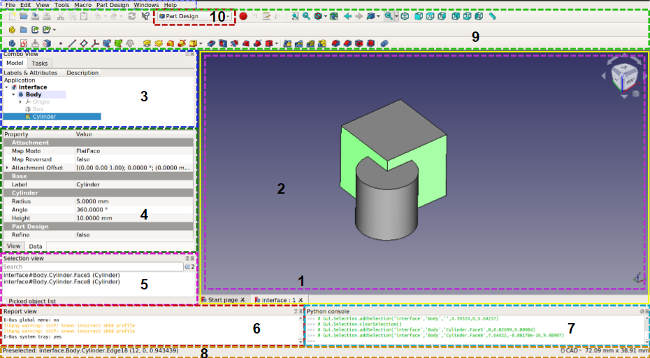 Концептуально интерфейс программы делится на верстаки каждый из которых является набором инструментов, адаптированных к конкретной задаче. Можно работать с сетками, 2-мерными объектами, эскизами. Если пользователю требуется несколько верстаков, каждый настраивается — добавляются/деактивируются инструменты. В некоторых случаях добавляются макросы. Самые популярные наборы инструментов — PartDesign/Part.
